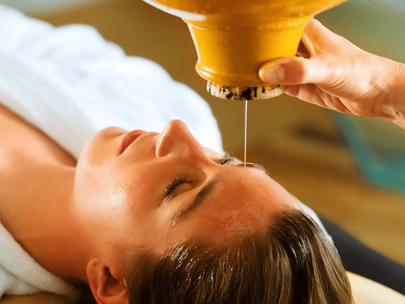 A calming therapy where warm herbal oil is gently poured over the forehead. It helps relax the mind, reduce stress, improve sleep, and enhance mental clarity.